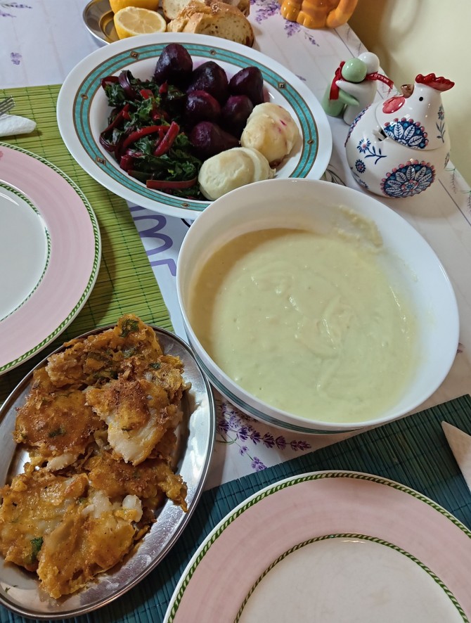 March 25 is a huge (and dual!) public holiday in Greece. The menu for lunch is the same in every home! It involves garlic dip (skordalia) and fried fish (traditionally, salt-cured cod).